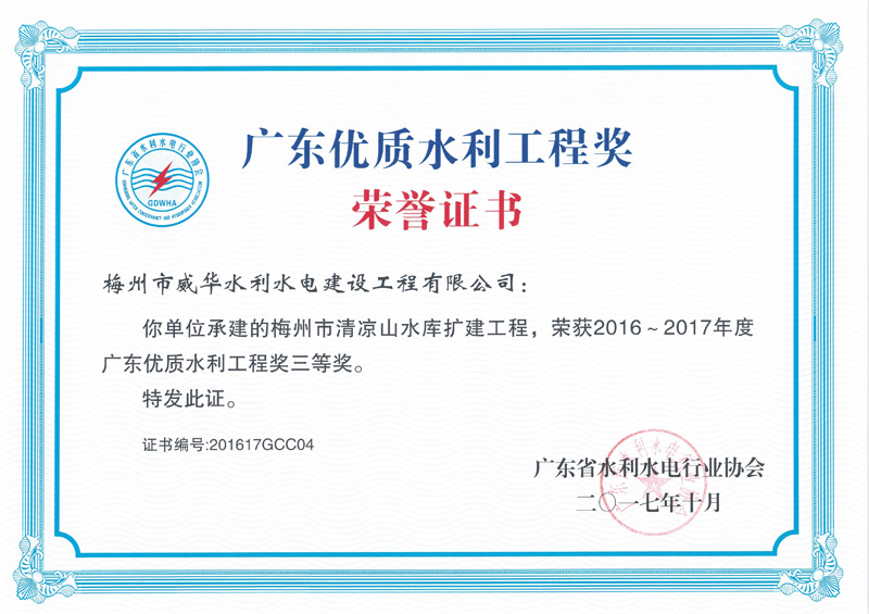 2017.10廣東省優(yōu)質(zhì)工程獎(jiǎng)三等獎(jiǎng)(清涼山水庫擴(kuò)建工程) (廣東省水利水電行業(yè)協(xié)會(huì))
